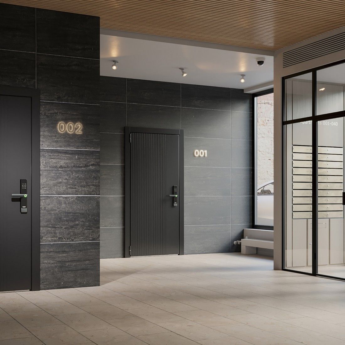 Дизайн Подсветка: кодовая панель, датчик отпечатка пальца; материал: сталь, закалённое стекло; цвет: чёрный